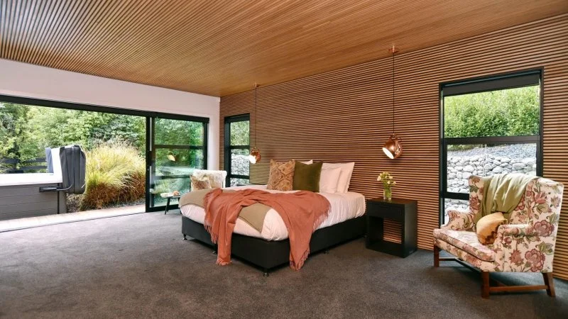 The master suite is a retreat with bespoke joinery in the elegant walk-in-wardrobe, rimu timber batten cladding on the ceiling and end wall creating a connection with nature, and a stunning ensuite.